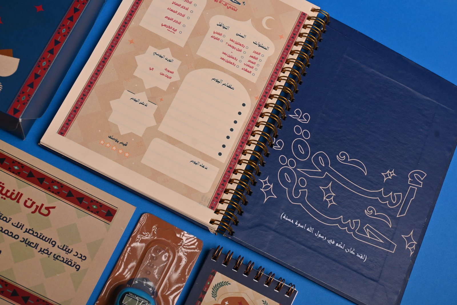 “بين دفتي هذا البوكس، تجتمع سكينة الروح مع جمال التصميم. صفحاتٌ كريمية دافئة تنتظر كلماتك، وأغلفةٌ مطبوعة بزخارف إسلامية عصرية وتدرجات كحلية عميقة تأخذك إلى رحاب الهدوء والتدبر في كل خطوة من رحلتك الروحانية.”
