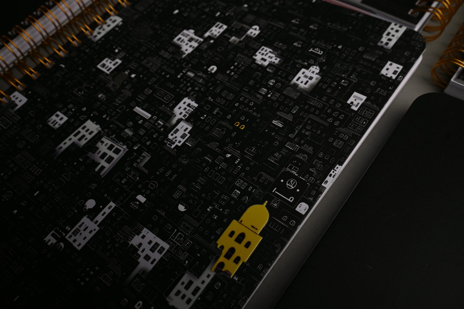 التأثير البصري: استخدام التباين الكلاسيكي بين الأسود والأبيض، مع إضافة “لمسة لونية وحيدة” باللون الأصفر الزاهي على أحد البيوت، مما يعطي إحساساً بالتميز، الأمل، والانفراد وسط الزحام.