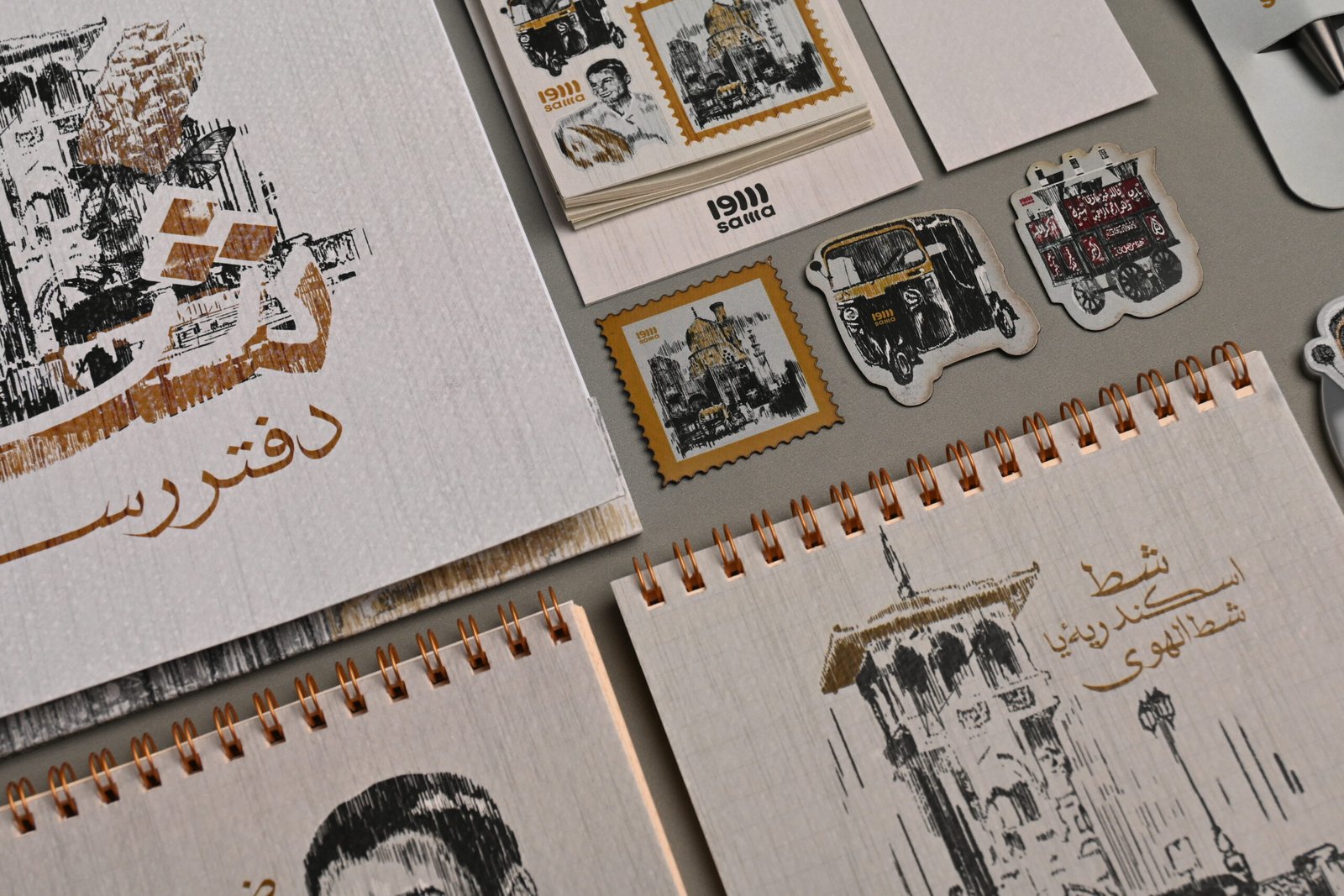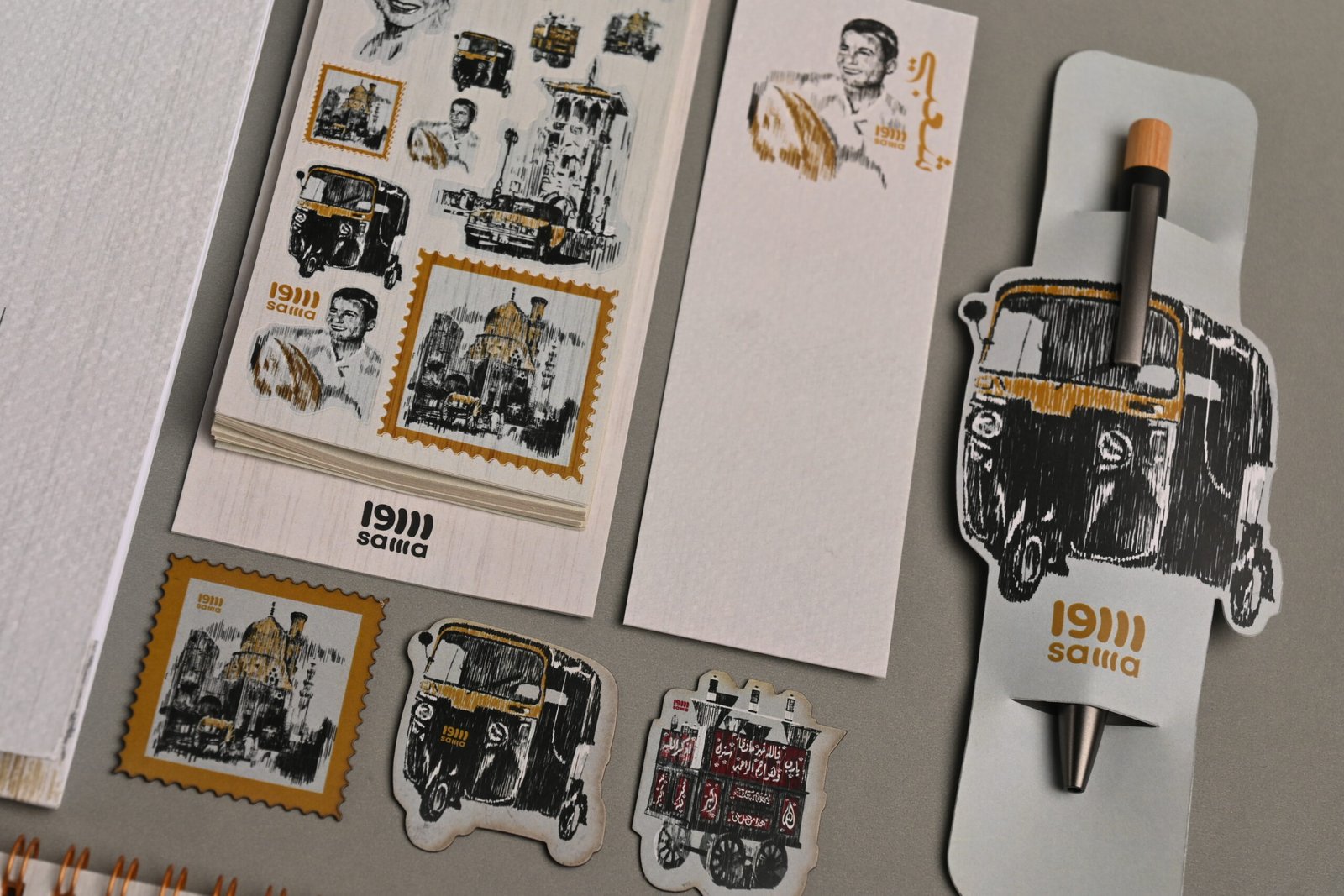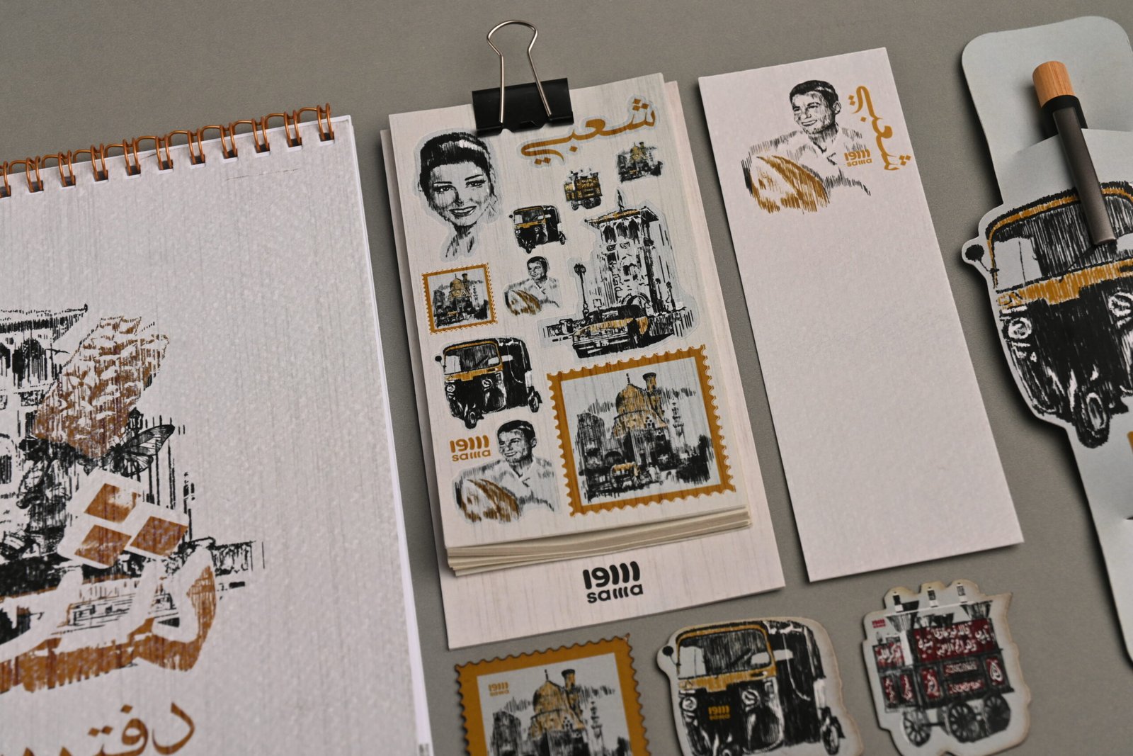 محتويات العبوة ثلاثة نوتات كل واحدة بتقسيمة دواخل مختلفة منها المسطر والمثلثات والمنقط كراسة رسم كبيرة من الورق الكريمي الدافئ منظم اسبوعي مع مجموعة مختارة من الاستيكرات الشعبية المميزة فاصل قراءة من ورق الفيبريانو المميز ثلاثة مغناطيسات ثلاجة مميزة قلم خشبي مع حامل شعبي خاص به كوستر اكريليك للإستخدام اليومي مع إضافة التوك توك البارز المميز