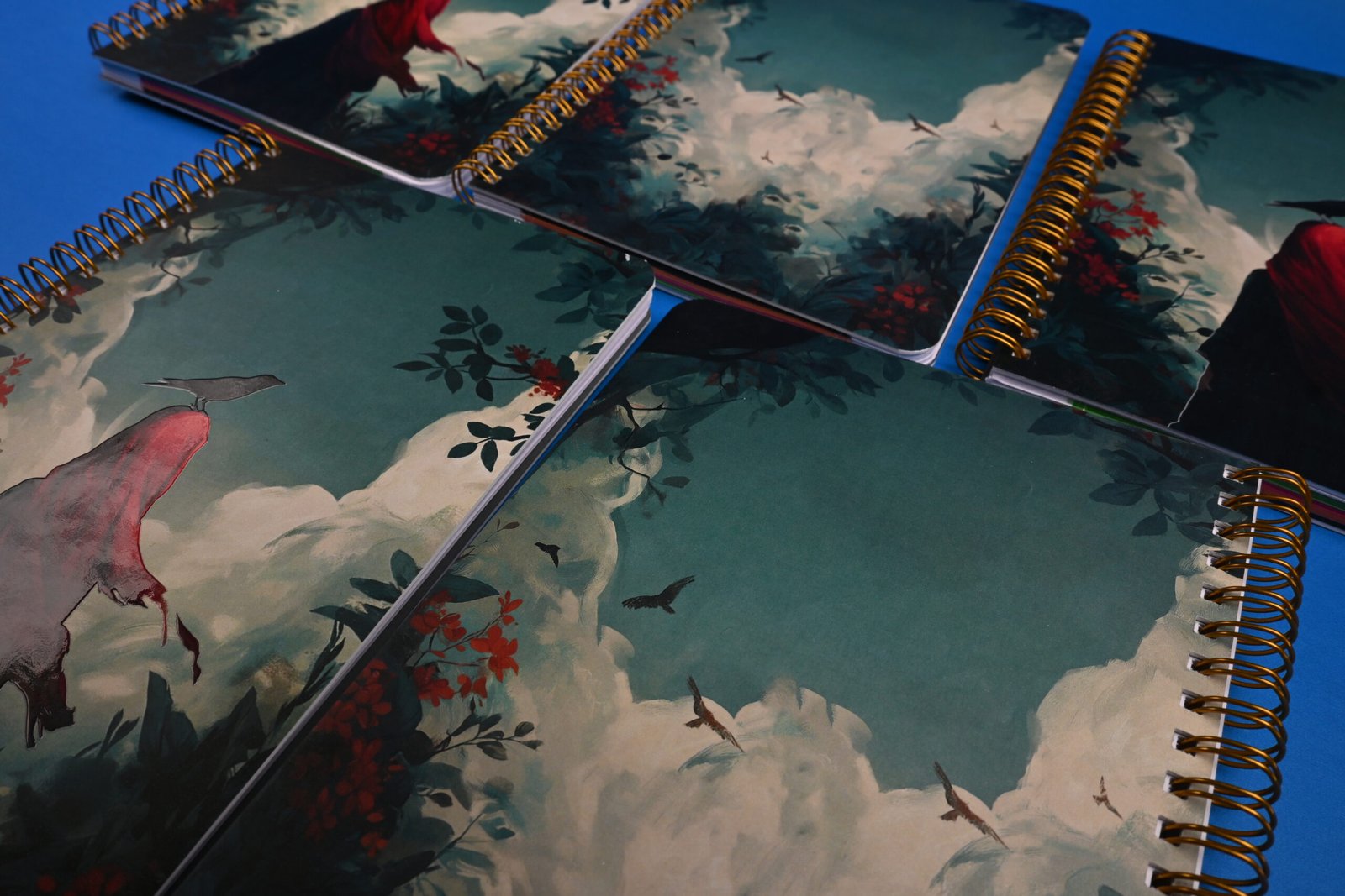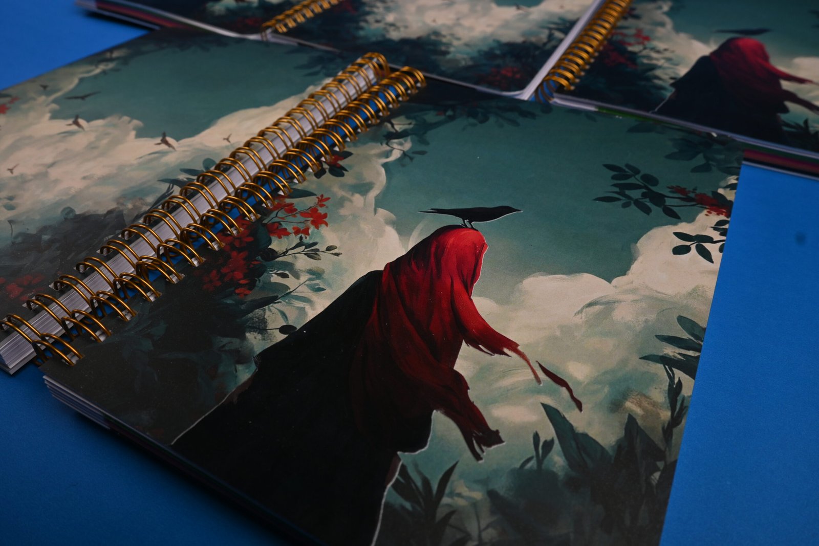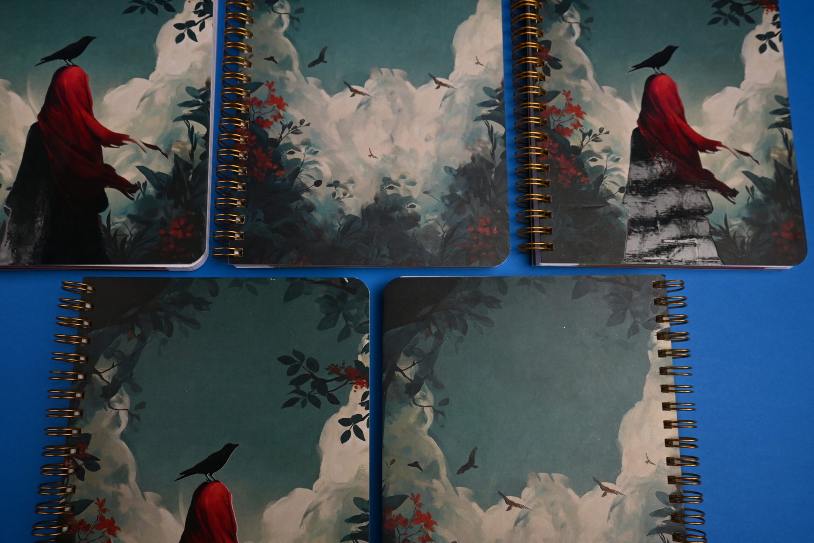 نمط التصميم: يعتمد الغلاف على أسلوب “الفن الرقمي السريالي”، حيث تظهر شخصية غامضة بوشاح أحمر زاهٍ وسط غابة كثيفة تندمج مع سحب داكنة.