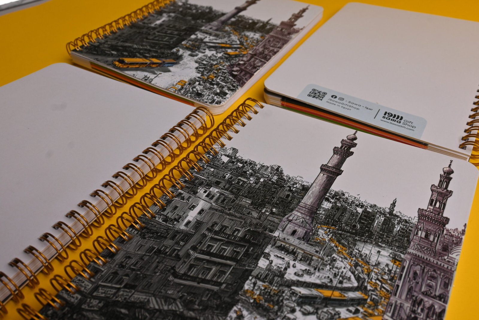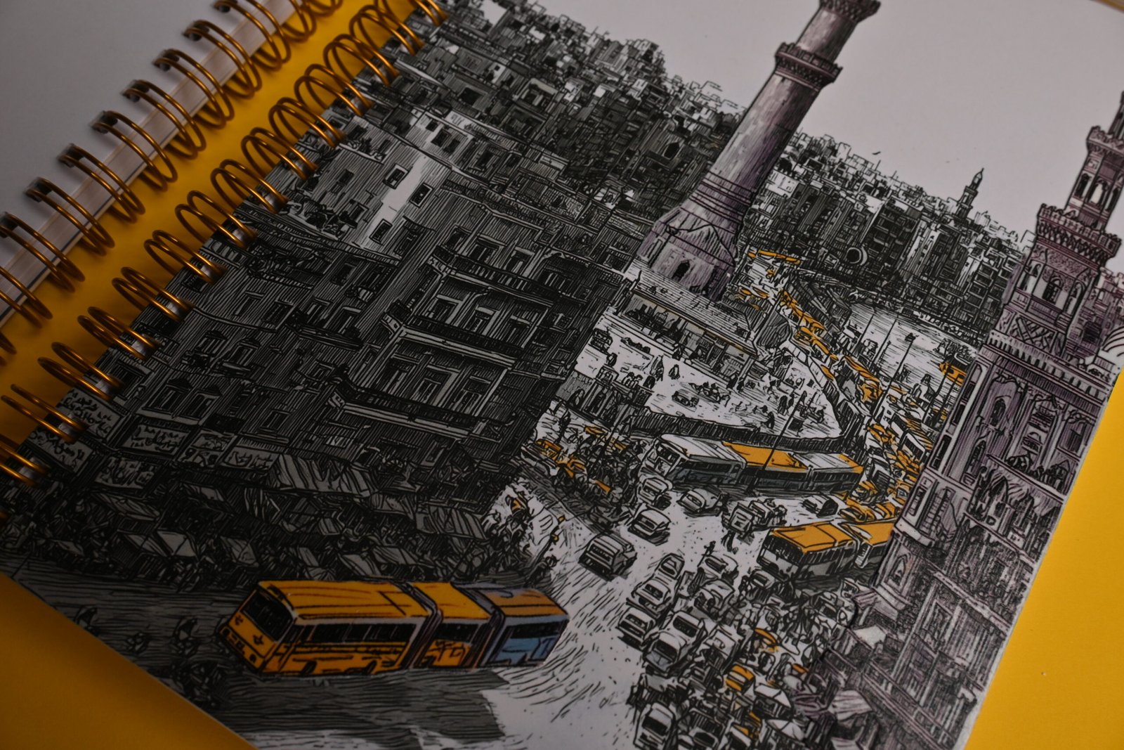 نمط التصميم: يعتمد الغلاف على فن “السكيتش المعماري” (Urban Sketching)، حيث تبرز مآذن المساجد التاريخية شاهقة فوق زحام الشوارع، والحافلات الصفراء المميزة التي تعكس هوية القاهرة البصرية.