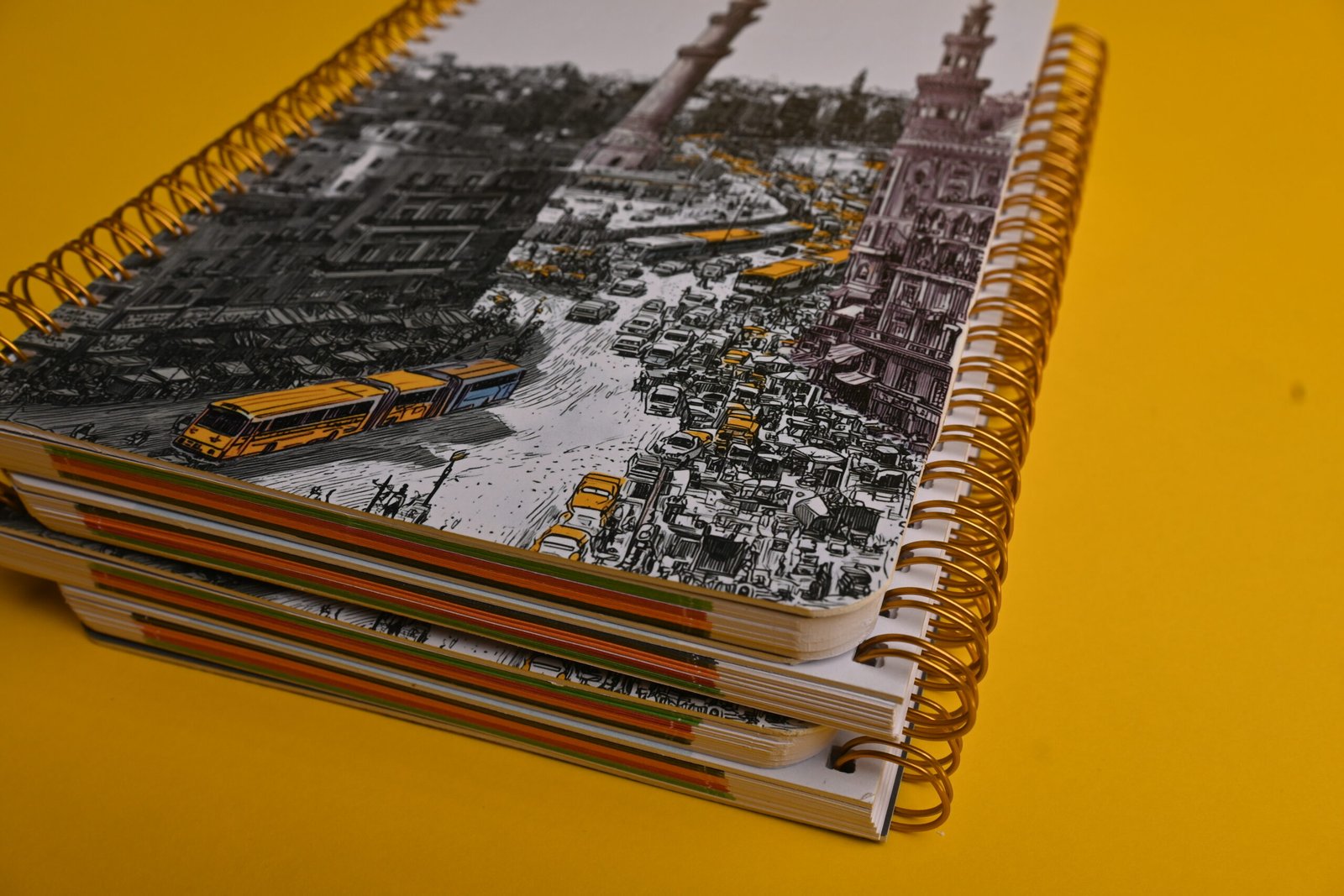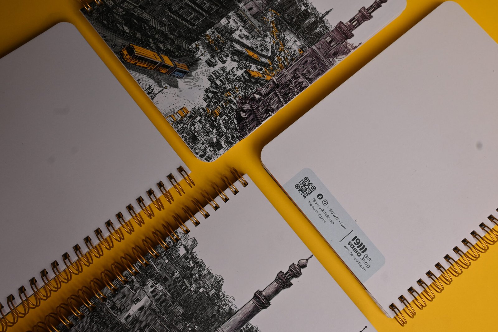 تجليد سلك مزدوج (Double Wire-O): سلك معدني مزدوج باللون الذهبي، يضيف لمسة من الفخامة التي تليق بهيبة المآذن الظاهرة على الغلاف.