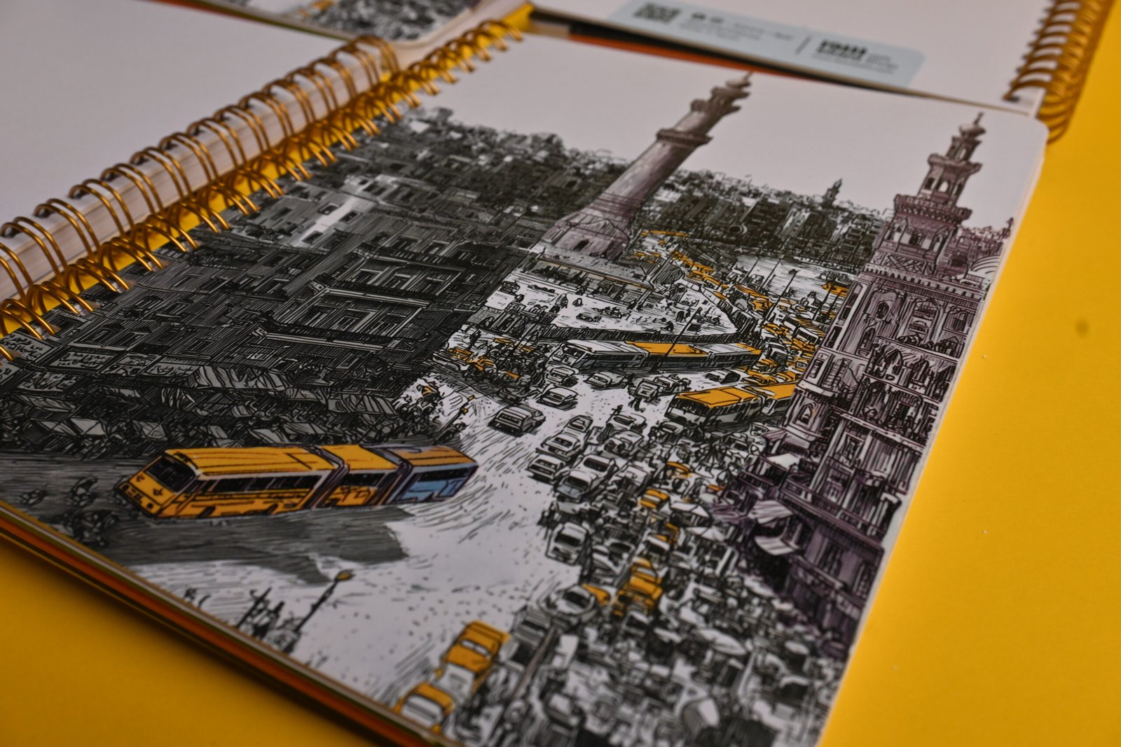 التأثير البصري: الرسم يعتمد على الخطوط الدقيقة “باللونين الأسود والأبيض” لإعطاء طابع كلاسيكي، مع إبراز “اللون الأصفر” في الحافلات فقط، مما يخلق توازناً فنياً يركز على الحركة والحياة.